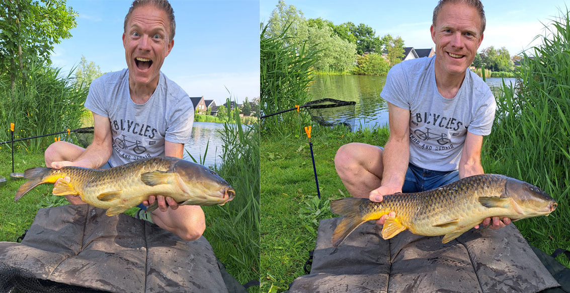 Nog altijd even blij als je zo'n joekel keurig op de kant krijg, Jeroen Lute (foto gemaakt door vismaatje ome Kees) met een vandaag in Uitgeest gevangen karper.