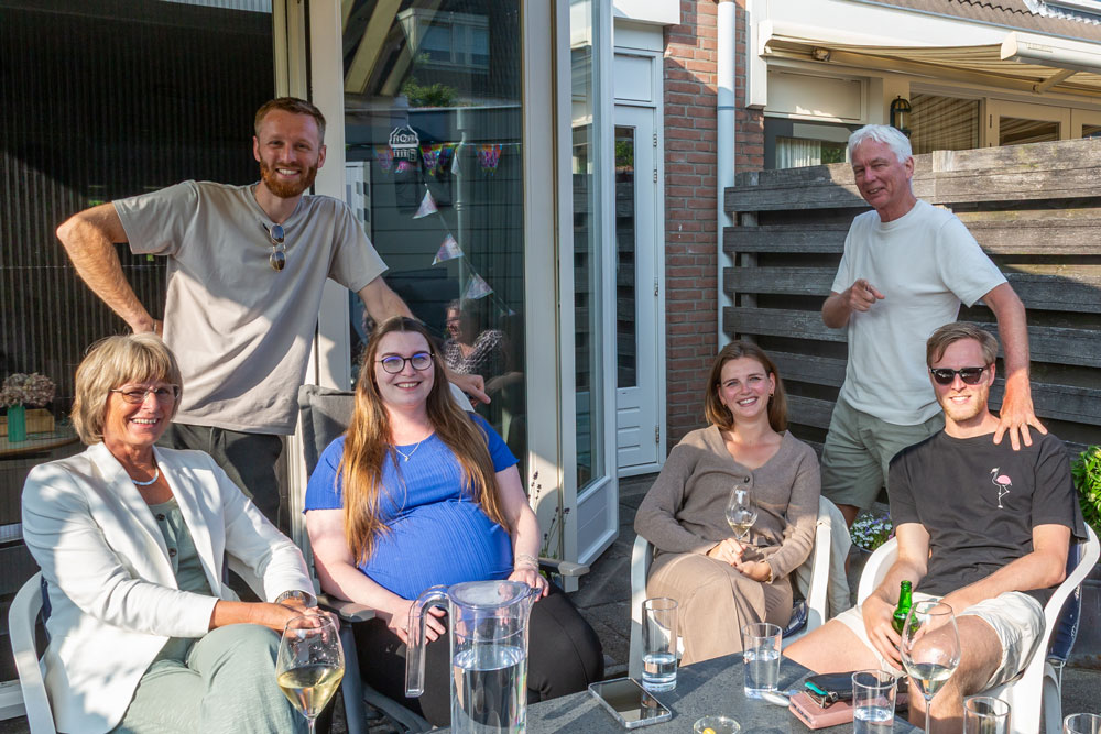 Vanmiddag gezellig aangezeten bij de jarige Jolanda Poel-Lute, met echtgenoot Jan die herinnerd werd aan zijn aankomend opa-schap, een leuke familiefoto en twee proostende zusjes.