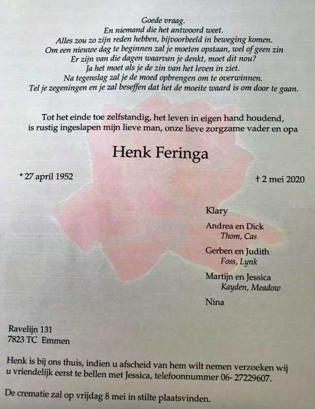 Afgelopen vrijdag is op 68 jarige leeftijd Henk Feringa overleden, hij was de (stief) (schoon) vader van Gerben en Judith van der Heide.