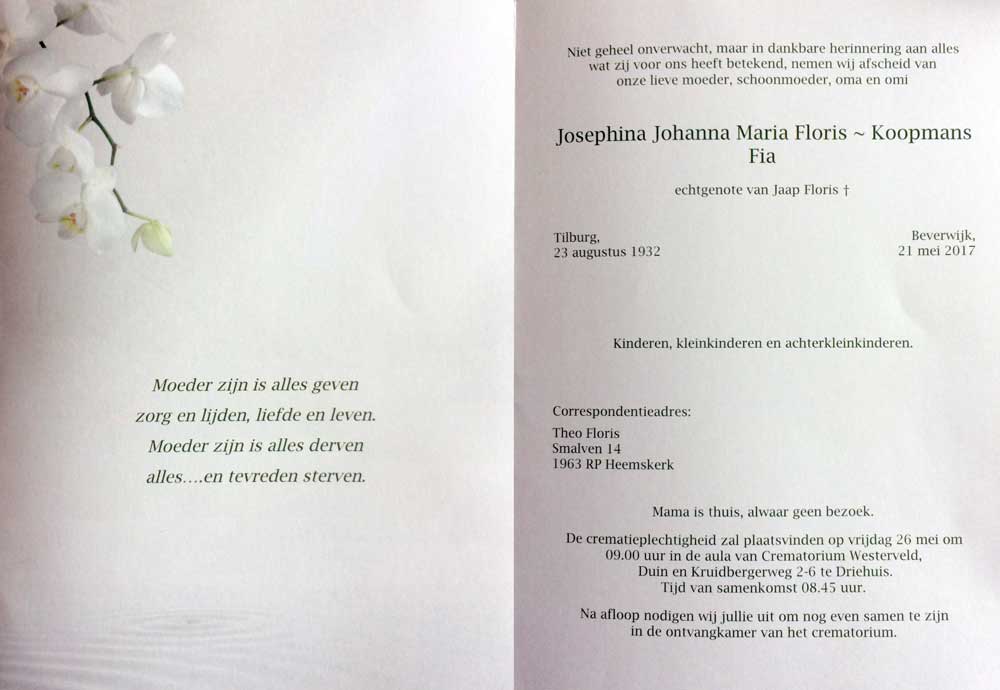 Afgelopen zondag is op 84 jarige leeftijd Fien Floris overleden, Fien was de vrouw van Jaap Floris een oud collega en goede vriend van vader Lute. Voor belangstellende hier een afdruk van de overlijdenskaart.
