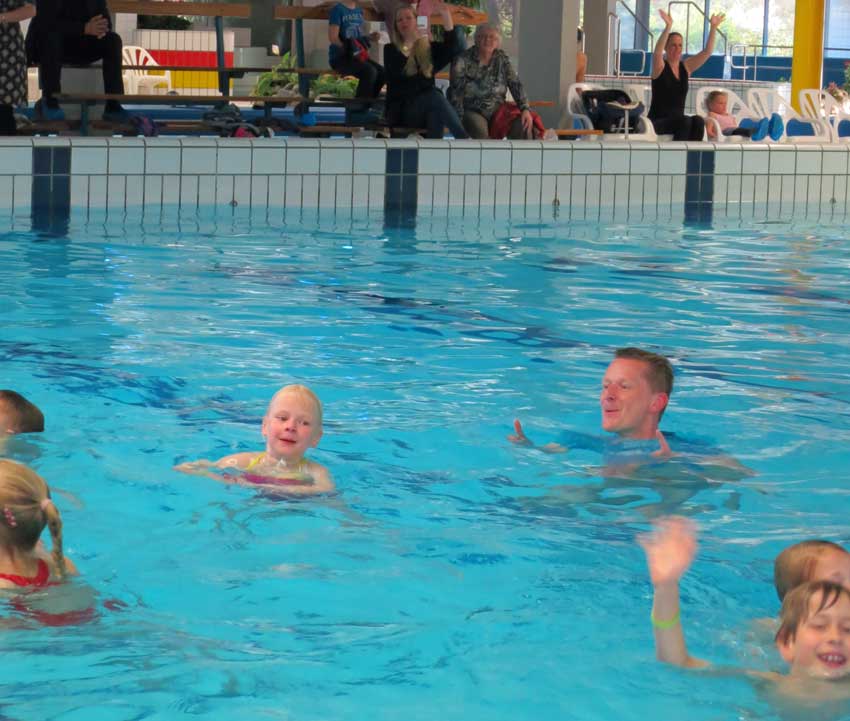 Inge Termes heeft vandaag met glans haar zwemdiploma A gehaald, na afloop mochten de ouders ook met kleren aan in het water springen en daar was vader Albert wel voor te porren.