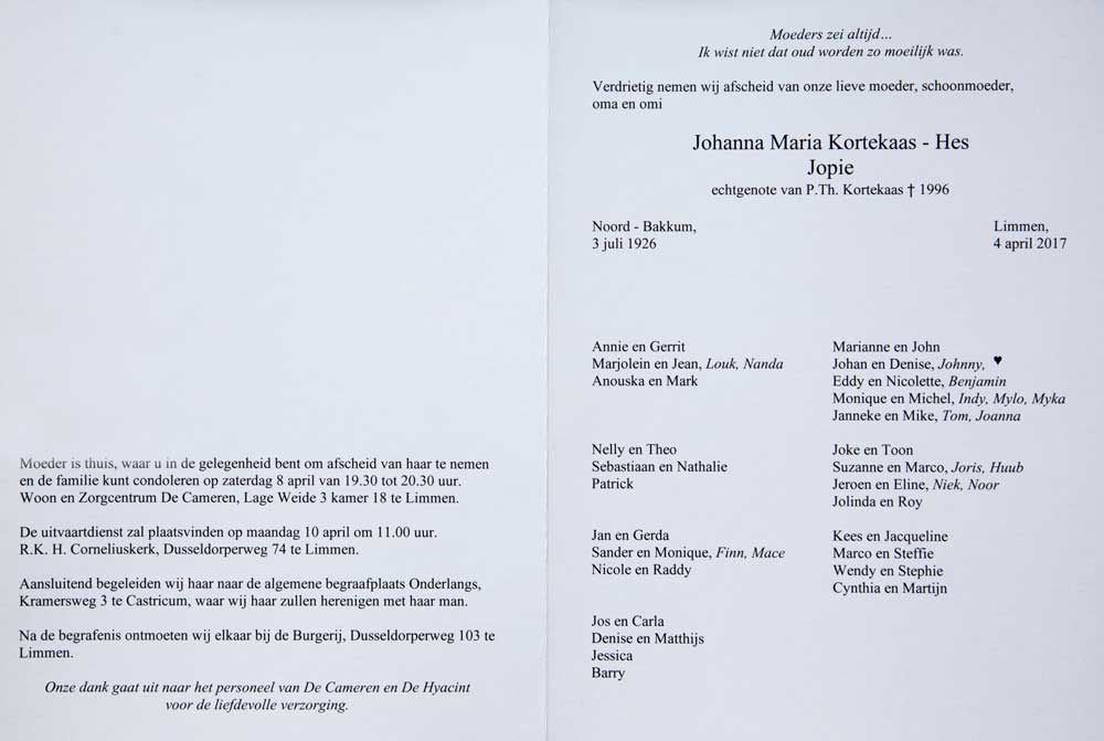 Voor belangstellende de overlijdenskaart van Jopie Kortekaas - Hes met daarop de datums en tijdstippen voor de condoleance op zaterdagavond 8 april en de begrafenis op maandagmorgen 10 april.