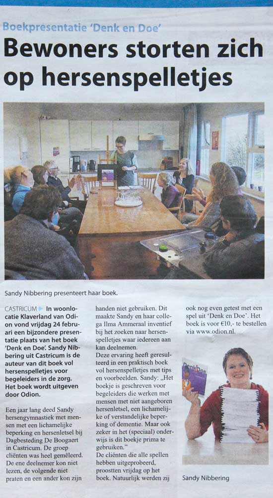 Vandaag een leuk artikel in het Nieuwsblad van Castricum over Sandy Nibbering die een boek heeft geschreven "Denk en Doe", met hersenspelletjes voor mensen met een lichamelijke beperking en hersenletsel.