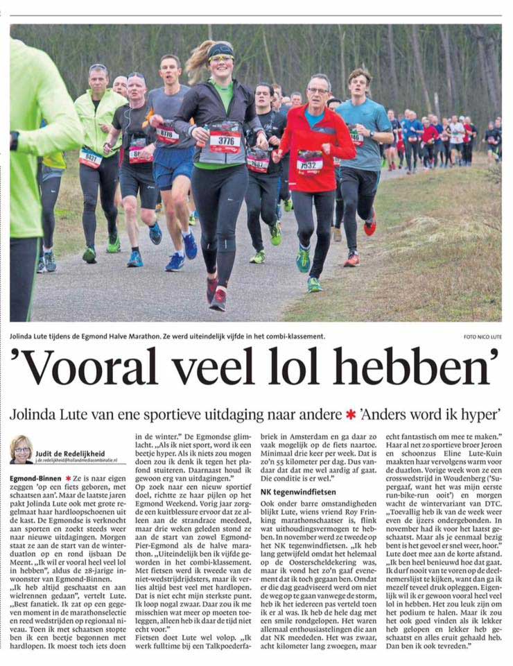 Gisteren toch wel een uniek momentje na de winterduathlon in Alkmaar, van de vier te verrijden afstanden stonden er bij drie een familielid op hoogste treedje. Eline Lute won bij de dames de lange afstand (10 km hardlopen en 20 km schaatsen), echtgenoot Jeroen Lute won bij de heren de korte afstand (5 km hardlopen en 10 km schaatsen) en zijn zusje Jolinda Lute won bij diezelfde korte afstand bij de dames. Afgelopen zaterdag stond er een interview met Jolinda in het Noordhollands Dagblad als voorbeschouwing op dit evenement.