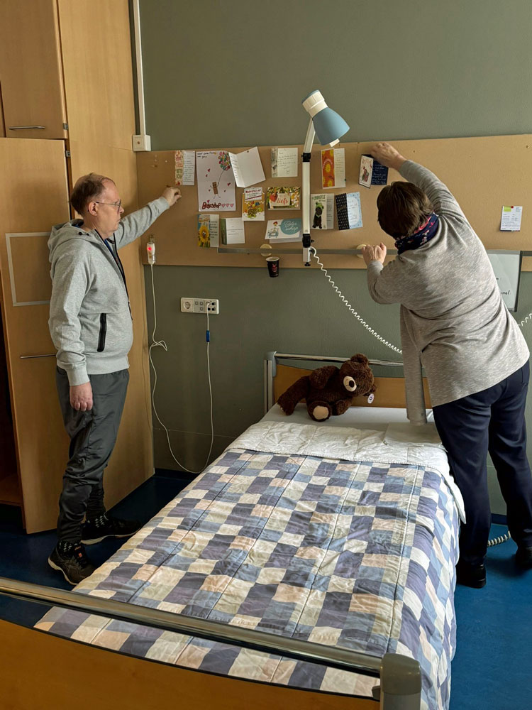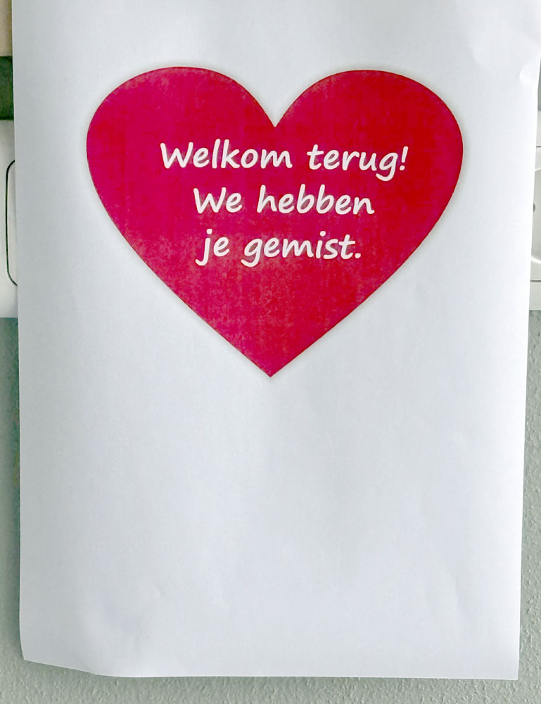 Na 9 dagen in het RKZ en aanpassing van de medicatie, is Frank de Reus weer terug in revalidatiecentrum Heliomare. Eén heel warm welkom door de verpleging, Frank’s bed was versierd met vlaggetjes en een poster aan het voeteinde met “We hebben je gemist”, geweldig. Wat hebben de doktoren en verpleegsters met hem meegeleefd en zijn ze weer blij dat Frank terug is voor zijn revalidatie. Adres is: