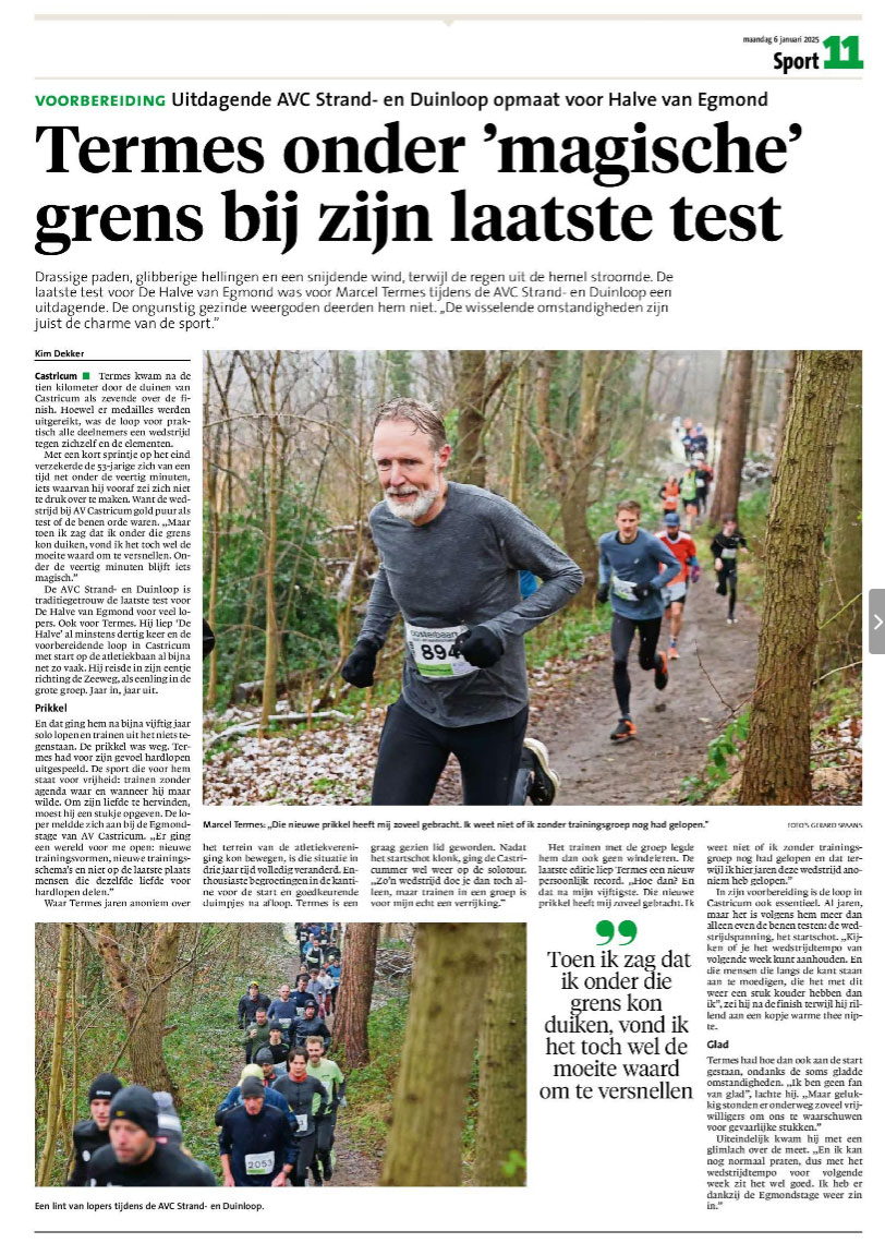 Vandaag een leuk artikel in Dagblad Kennemerland over Marcel Termes en zijn hervonden passie in het hardlopen, hij liep de 10,1 km in 39:51. Ook aanwezig Joris le Mair (2,2 km in 11.12. Inge Termes (2,2 km in 9.59), Niels Termes (4 km in 19:45) en natuurlijk Peter Out (15 km in 1:29:59). Nu op naar volgende week, de klassieker onder de trimlopen, de halve marathon van Egmond hopen op beter weer zodat de nieuwsredacteur weer een paar plaatjes kan schieten.