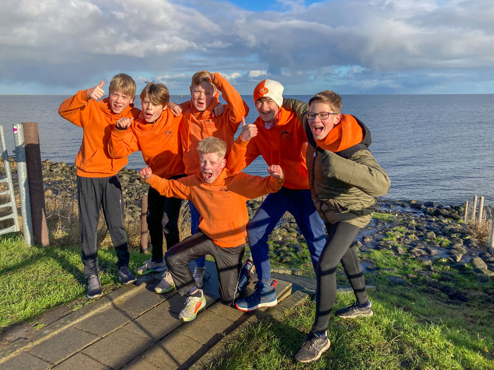 Nog een leuke foto van de "Foute-Kersttruien-Training" bij AV Castricum met o.a. trainer Albert Termes, zoon Niels en Joris le Mair.