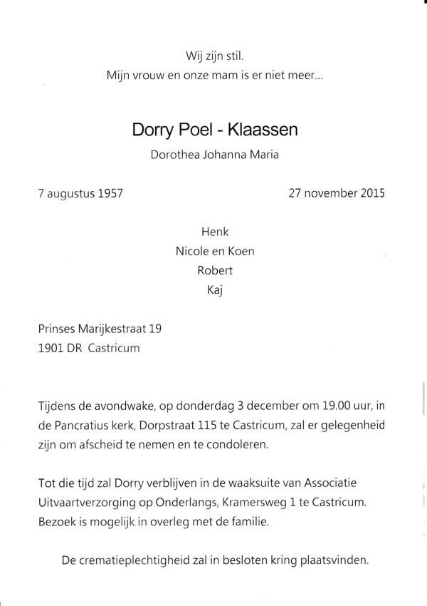Voor belangstellende hierbij de overlijdenskaart van Dorry Poel.