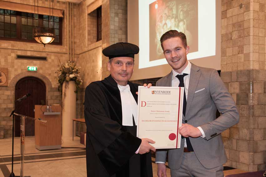 Chris Nooij heeft gisteren zijn Bachelor-diploma Accountancy in het ontvangst moge nemen in het bijzijn van zijn familie op het terrein van Nyenrode in Breukelen.