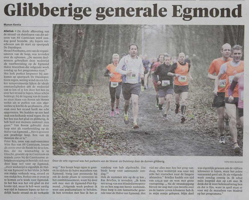Gistermorgen is de nieuwsredacteur even naar strand van Bakkum gefietst om daar te zien of er nog familieleden mee liepen met de Bos en strandloop van AV Castricum, als voorbereiding op de halve marathon van Egmond a.s. zondag. Ik heb er drie waargenomen Albert Termes die de 10,2 km liep en Peter Out en Eline Lute die de 15 km liepen, Eline wist eerste dame te worden en stond ook op foto vanmorgen in het Noordhollands Dagblad.