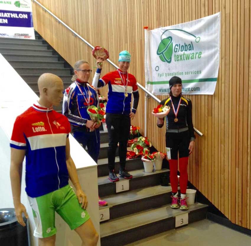 Eline Lute is vanmiddag in Groningen Nederlands Kampioen Wintertriathlon geworden, na 10 lopen, 50 km fietsen en 20 km schaatsen was ze bijna 2 minuten sneller dan de nummer 2. Ook op NOS teletekst werd deze topprestatie genoemd en natuurlijk even een kampioensselfie.