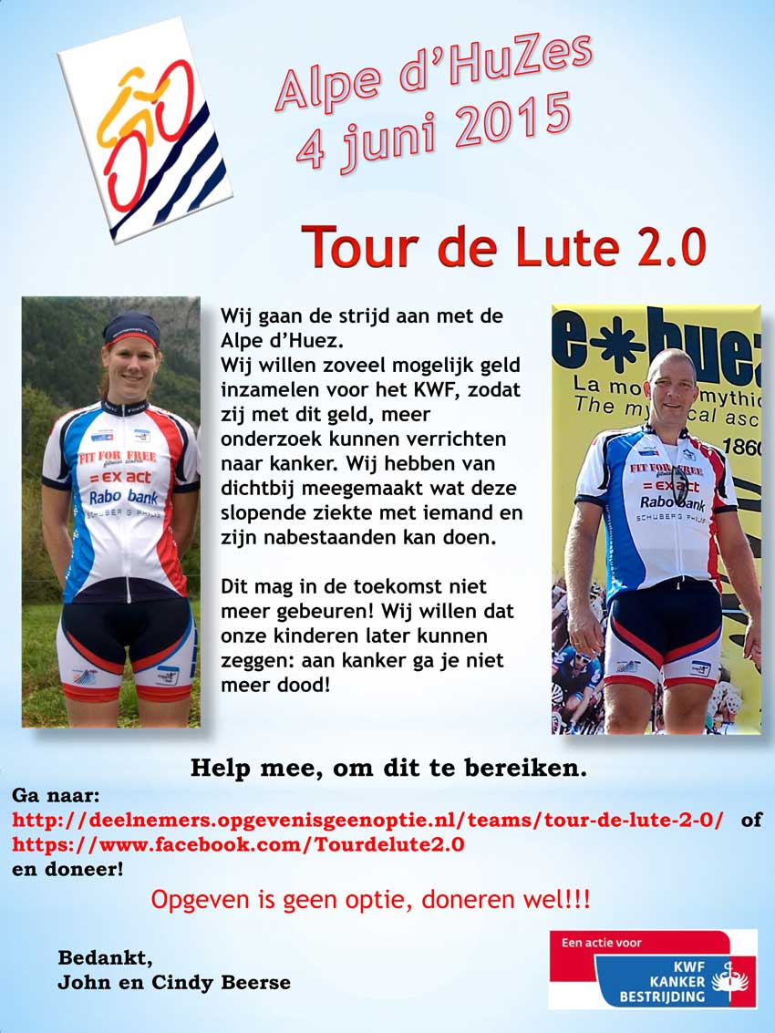 De poster van het KWF Alpe d'HuZes initiatief Tour de Lute 2.0 is klaar, dus voor degene die deze wil ophangen even een berichtje naar John en Cindy Beerse en natuurlijk mag doneren ook.