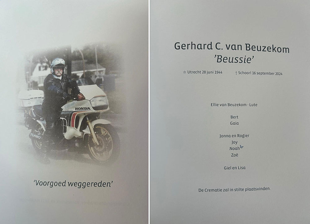 Afgelopen maandag is op 80 jarige leeftijd Gerhard van Beuzekom overleden, hij was getrouwd met Ellie van ome Antoon en leed aan kanker.
