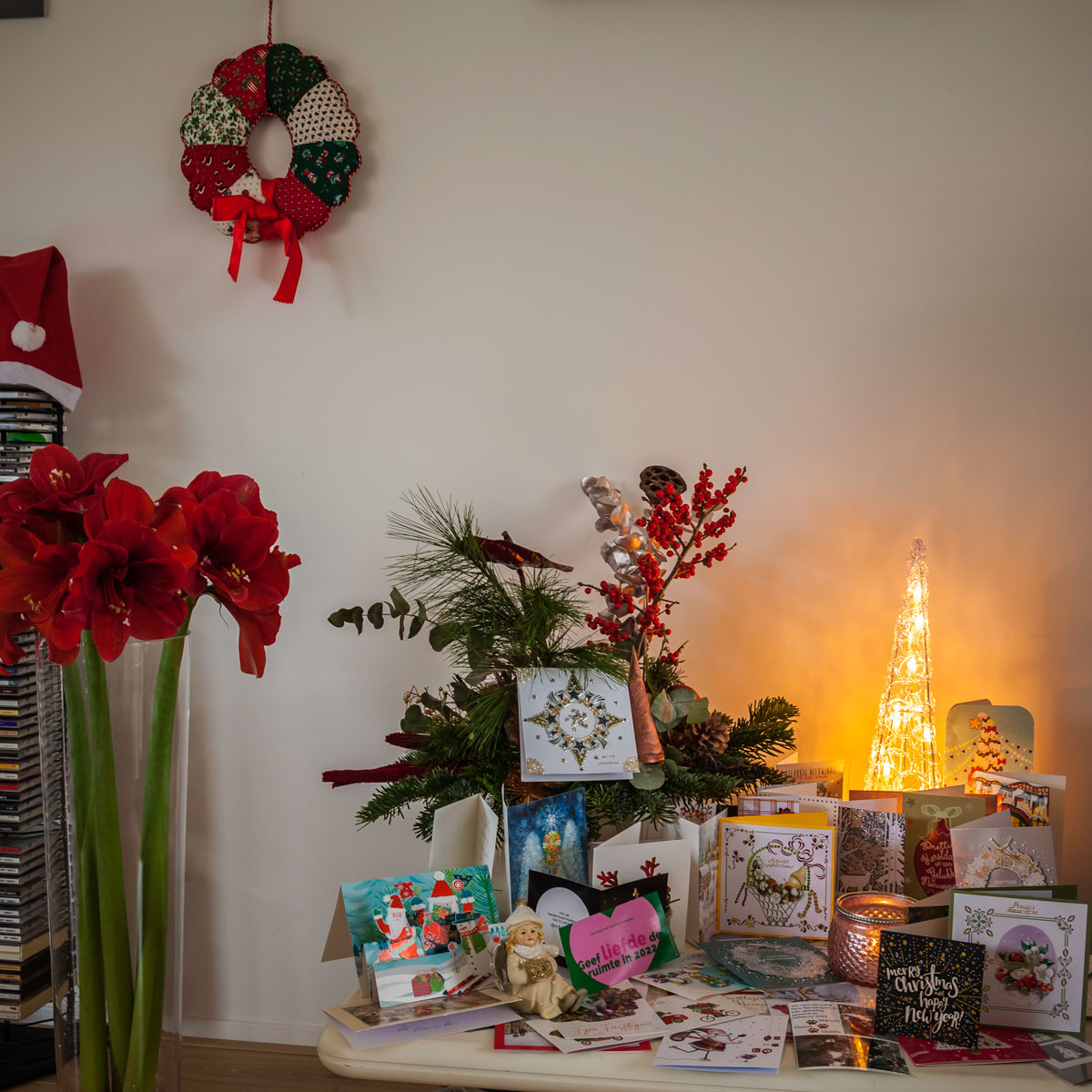 Vanuit onze gezellige woonkamer wensen wij jullie, ondanks wat beperkingen, fijne en gezellige kerstdagen toe.